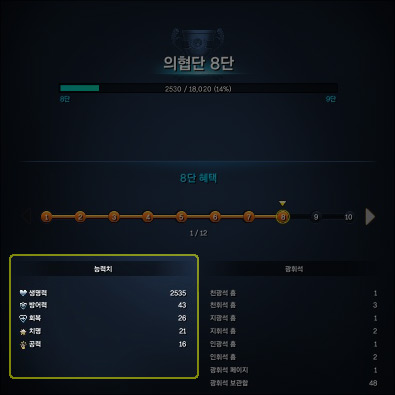 의협단 레벨인 단을 상승시킬 때마다 능력치와 광휘석 홈이 추가된다.
